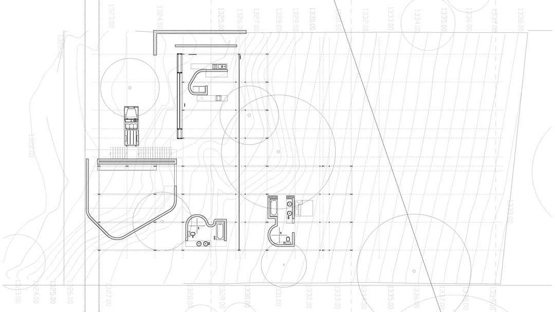 Studio and house are separated by the entrance courtyard. The artist, a sculptor, reduces tree trunks to both beautiful wooden sculptures – and clever satires on everyday culture. The studio takes on an organic shape, derived from the contours on site. It nestles cosily between city views and the best of both north and south. A staircase extends to the first platform for living: a simple rectilinear pavilion by contrast to the organic studio. Service cores, such as kitchen and bathrooms also take on curvilinear shapes, contrasting the rigid steel framework of the main pavilion. From the latter, platforms continue to step up the slope according to ritual.