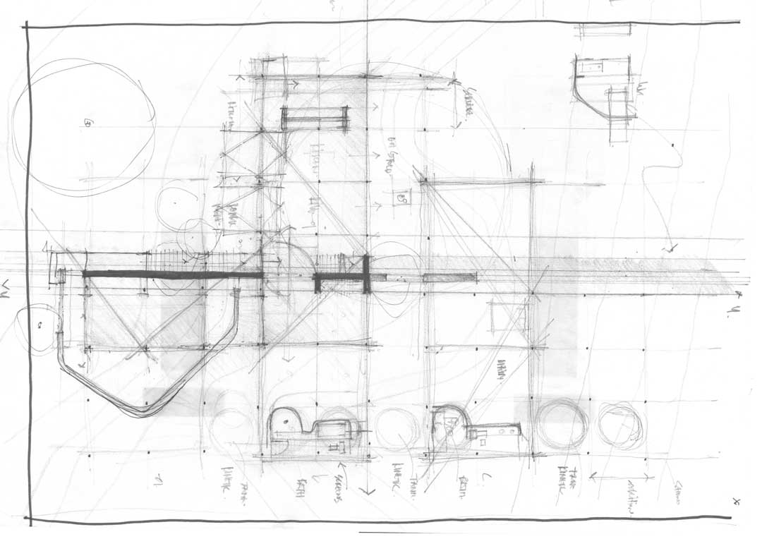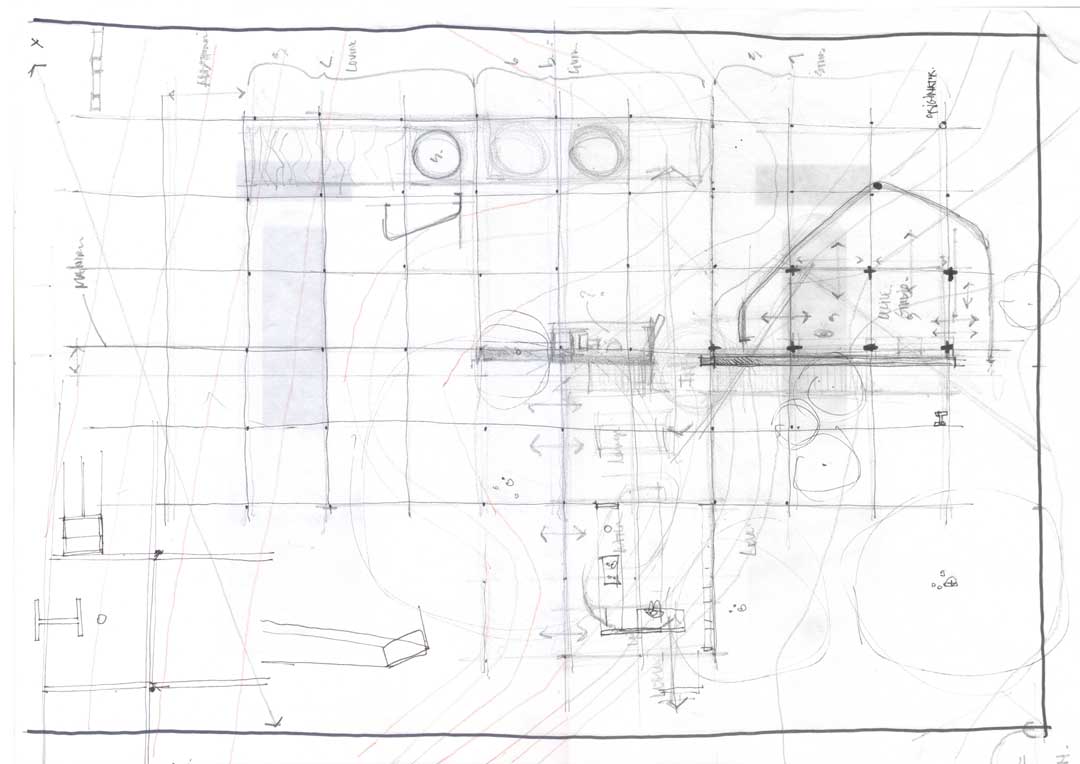 The platforms are united with a slanting roof which follows the incline of the site. This provides a multitude of spatial opportunities in between the various platforms.