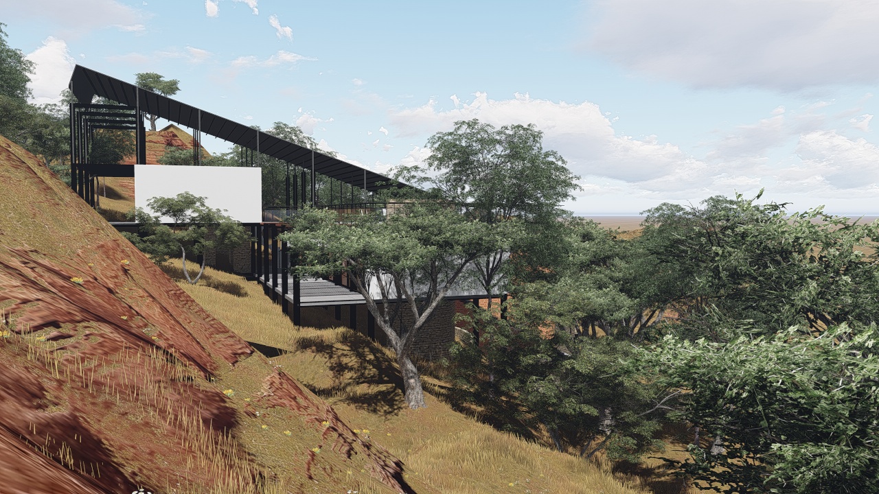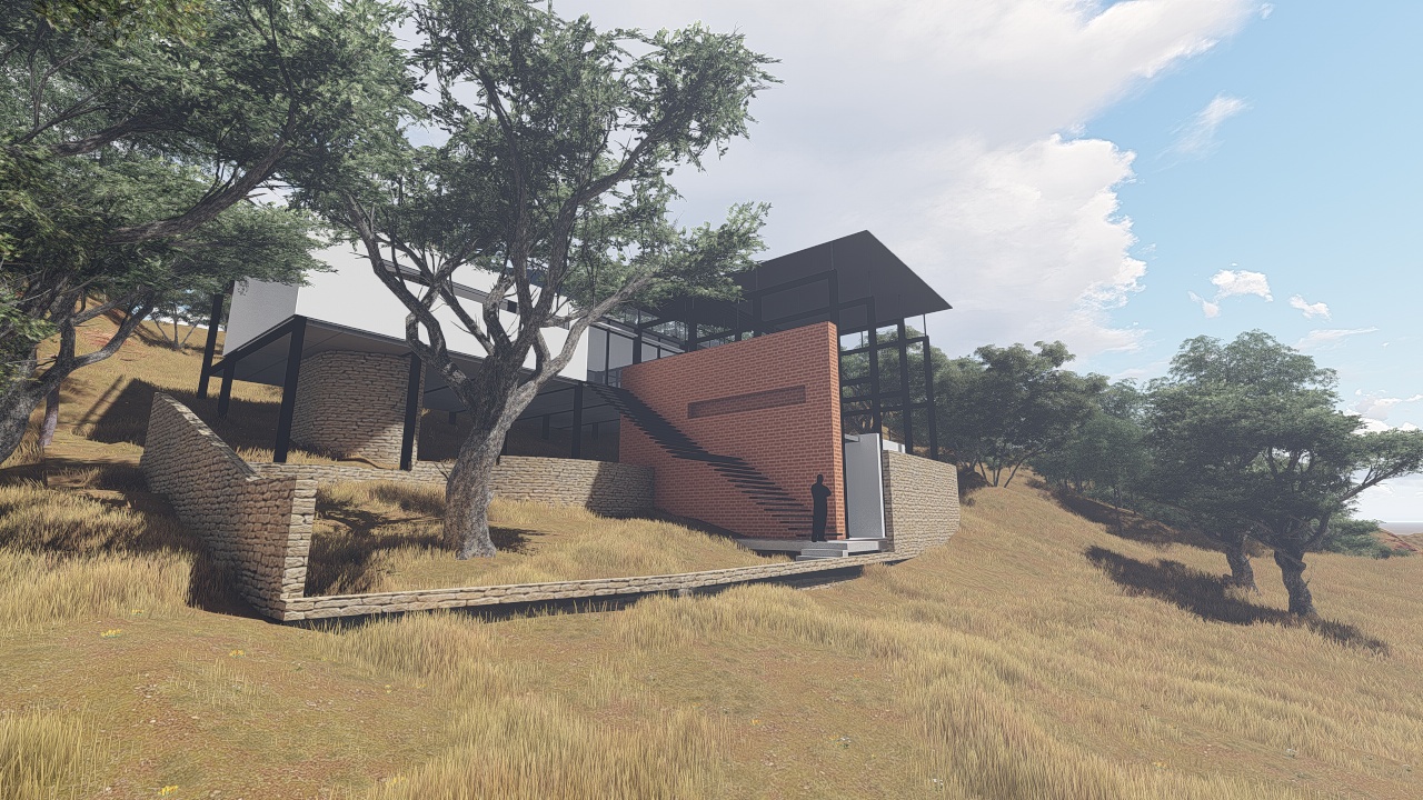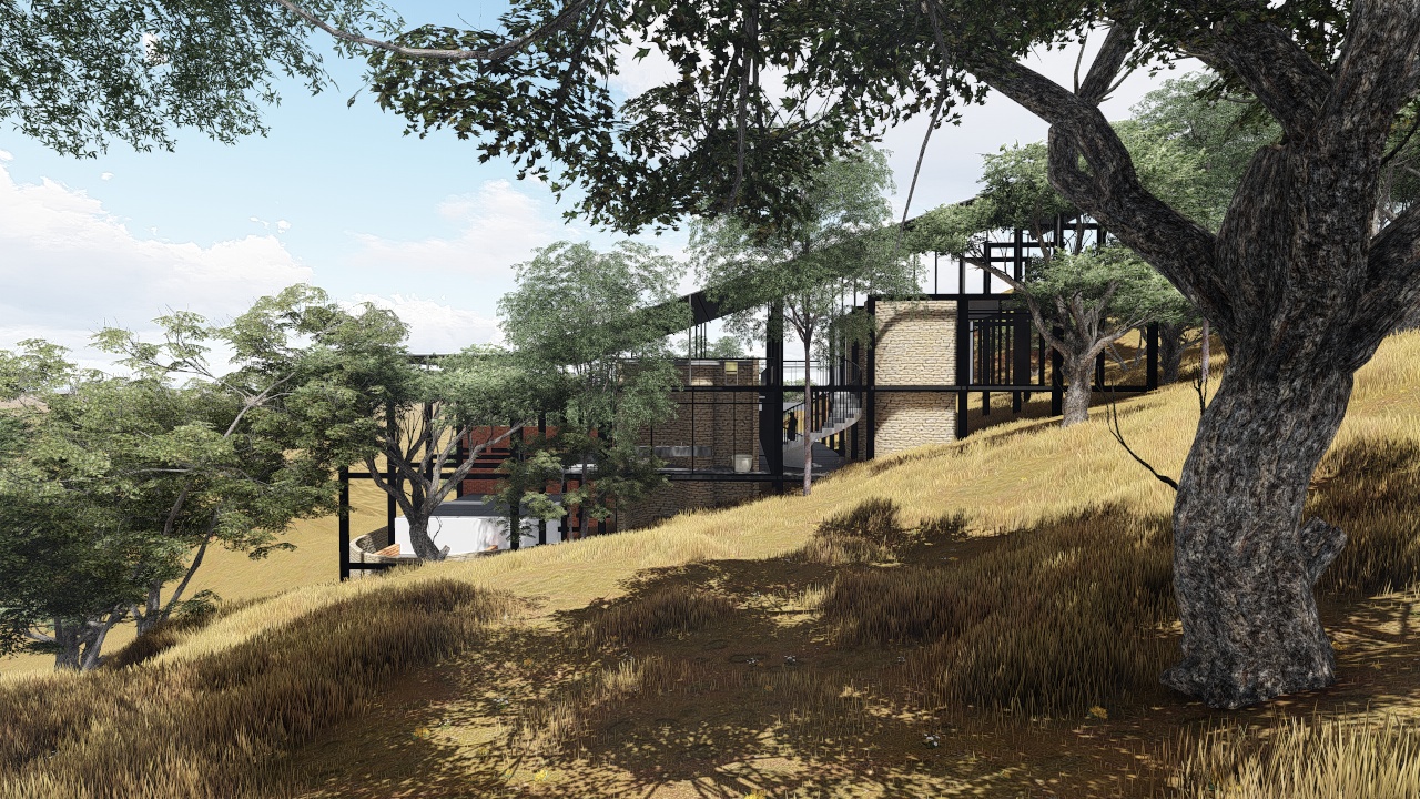 An artist and her pilot-husband asked for an inventive, affordable house and studio. The beautiful setting, on the steep southern hangs of the Magaliesberg, faces Pretoria. To the north it borders on the Magaliesberg Nature Reserve, to the south it overlooks suburban Pretoria. Both the Voortrekker Monument and Freedom Park are visible in the distance. The living pavilion steps along the contours of the slope, sidestepping the most important indigenous trees. Elevated platforms relate to thresholds, rituals and particular views. From a pragmatic point of view it provides the opportunity to build the structure in different phases, in accordance with a tight budget.