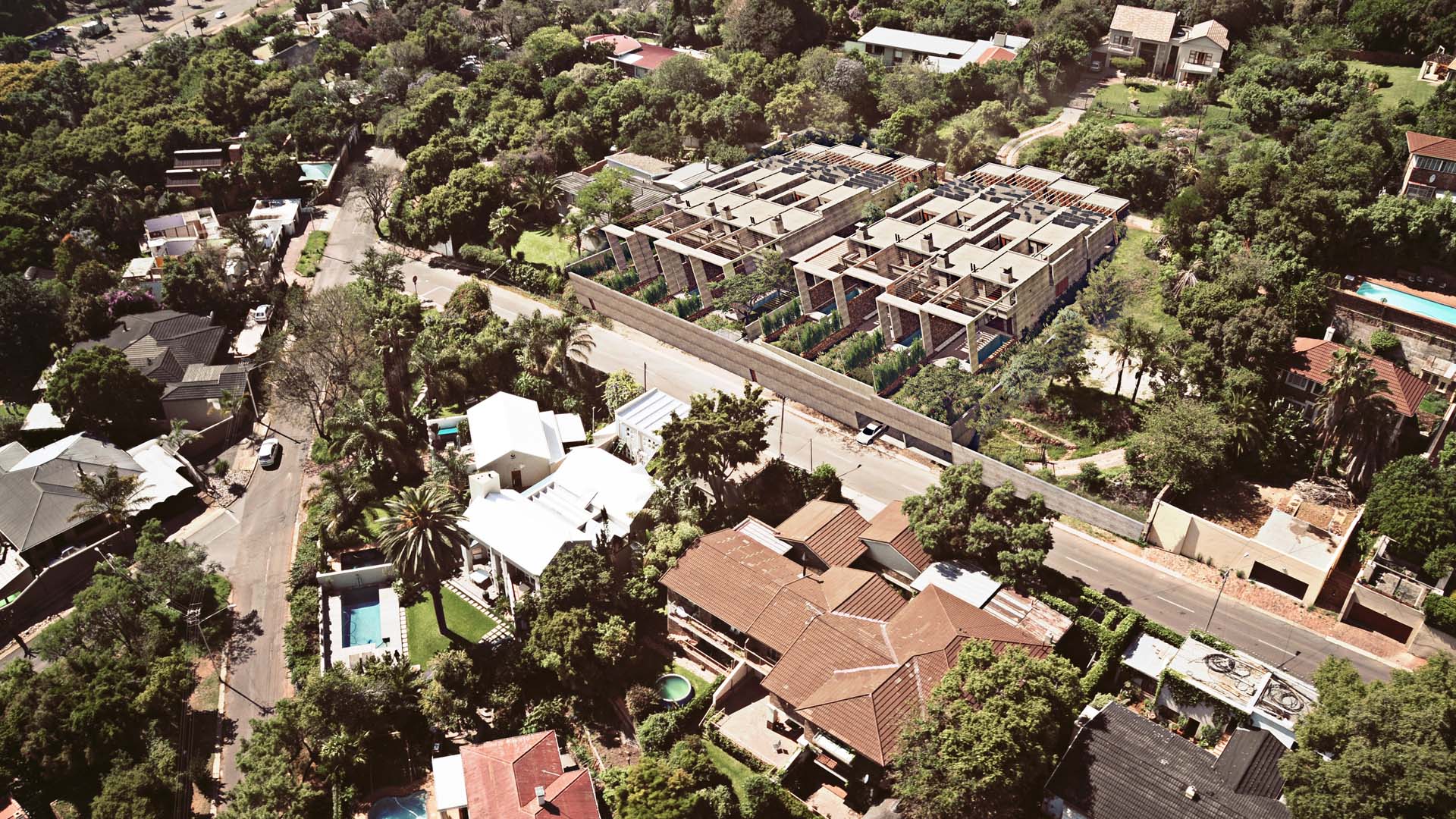 Situated on a sheer slope, the 4164m² site overlooks Pretoria CBD and the Union Buildings to the north. It is bordered on three sides by stand alone houses, and busy Berea Street immediately to the north. A high concrete wall partially retains the northern edge. The client needed a residential development of eight units, each roughly 350m² in size. While being comfortable and top-quality, low maintenance and environmental awareness had to drive design decisions. The design also had to respond to the distinctiveness of the site, within a stone’s throw of the bustling city of Pretoria.