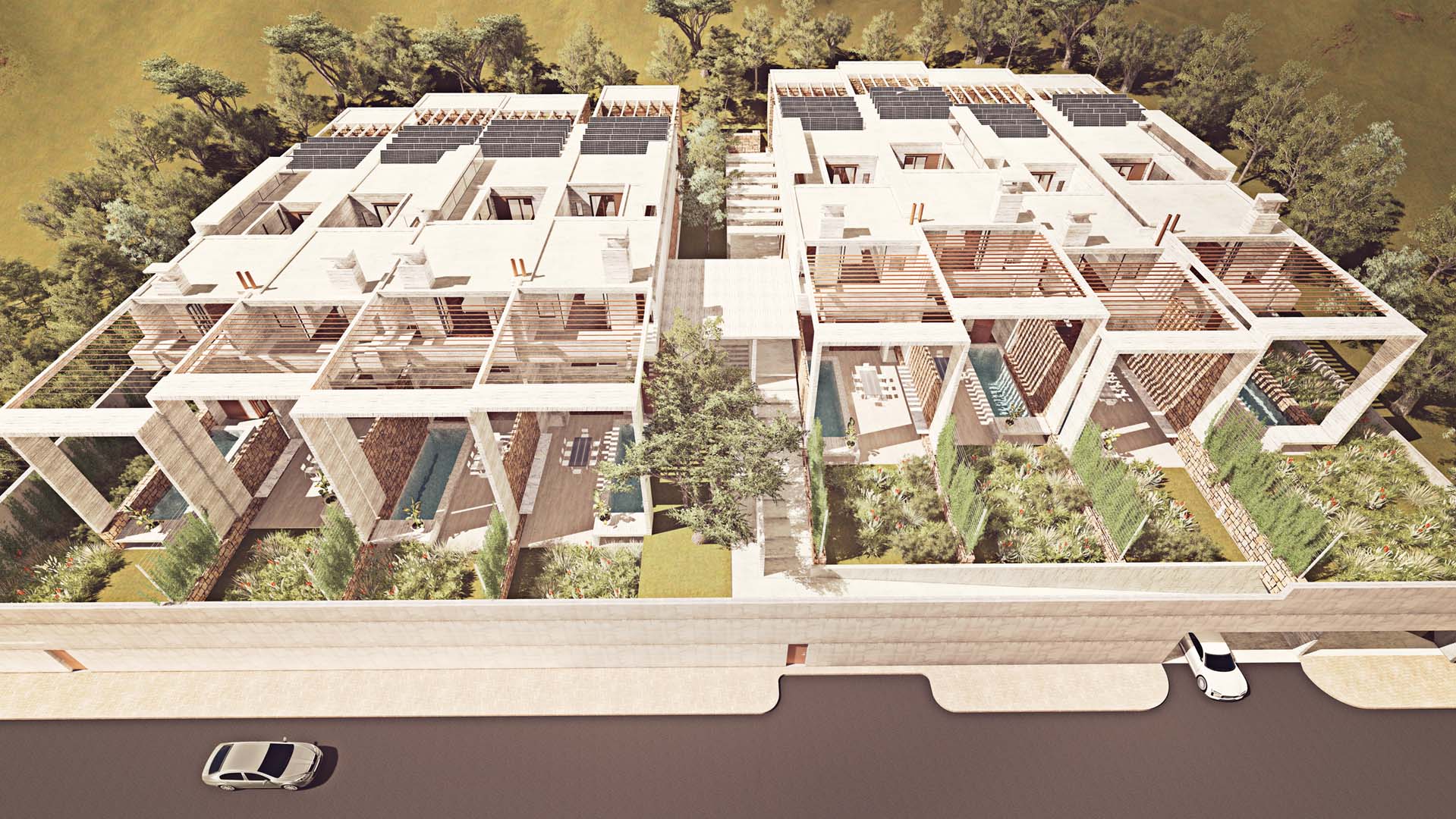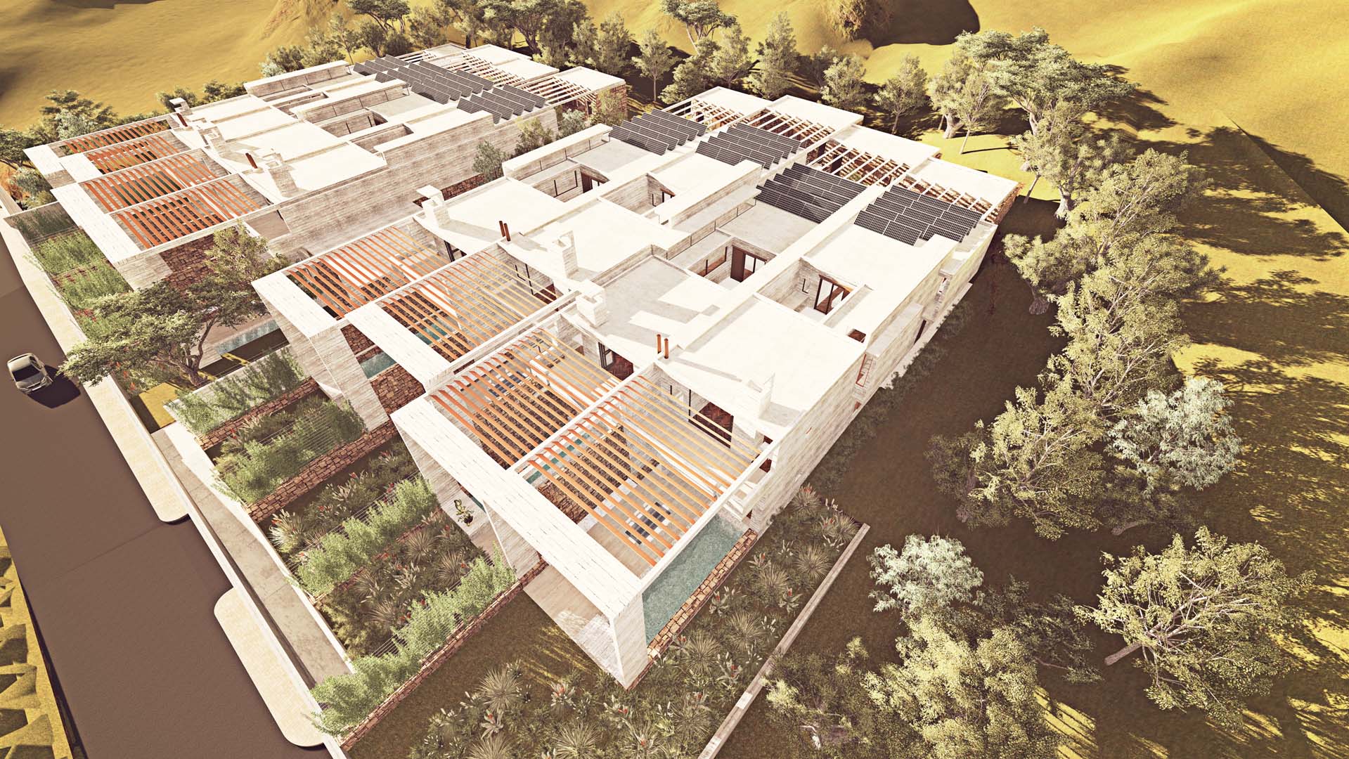Exposure to the equatorial window caused weighing up of various orientation alternatives. Ultimately, instead of terracing the site and allowing cars to access it, a basement was tucked underneath the terrain. This was simplified by the dramatic slope of the site. In addition, units were turned along a north-south axis – ensuring constant views of the city without compromising privacy. While each unit would step along the slope of the site, making each unique; these steps would also allow northern exposure. A central elevator and staircase lead from the basement to a centrally located entrance, which is also accessible by pedestrians entering from street level. Each one of the units is then accessed along a textured pedestrian pathway.