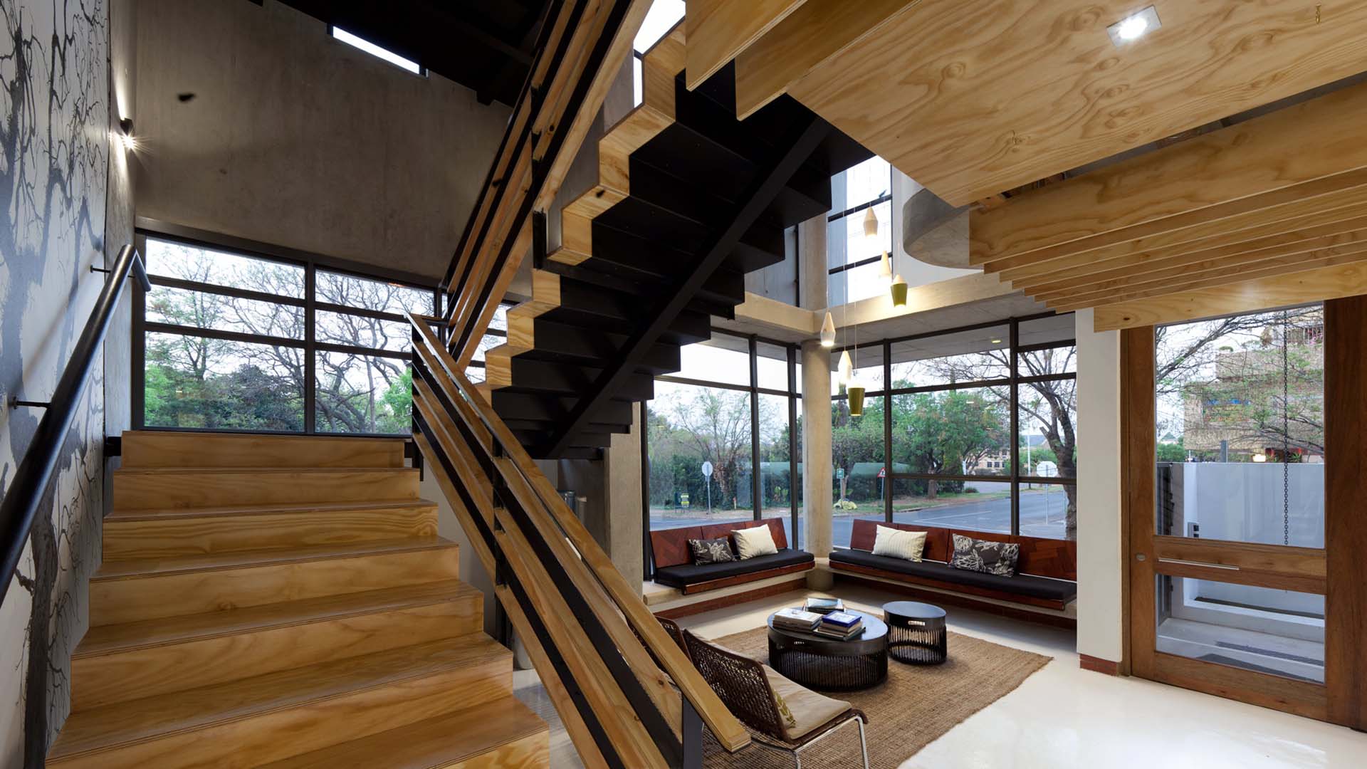 While several massing options were tested on the site from the outset, the building footprint was ultimately a combination of both best urban principles and statutory requirements. The corner of Tram and Bronkhorst is celebrated as the major vertical definition in the design, with a triple volume that is expressed on the outside of the building facade. The edges of the site is landscaped as linear water features, recalling the original canal system of the city. These also act as thresholds to the site. Pedestrian entrance is along the eastern edge.