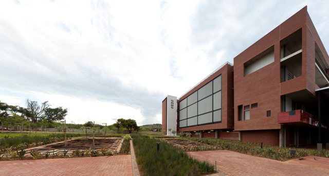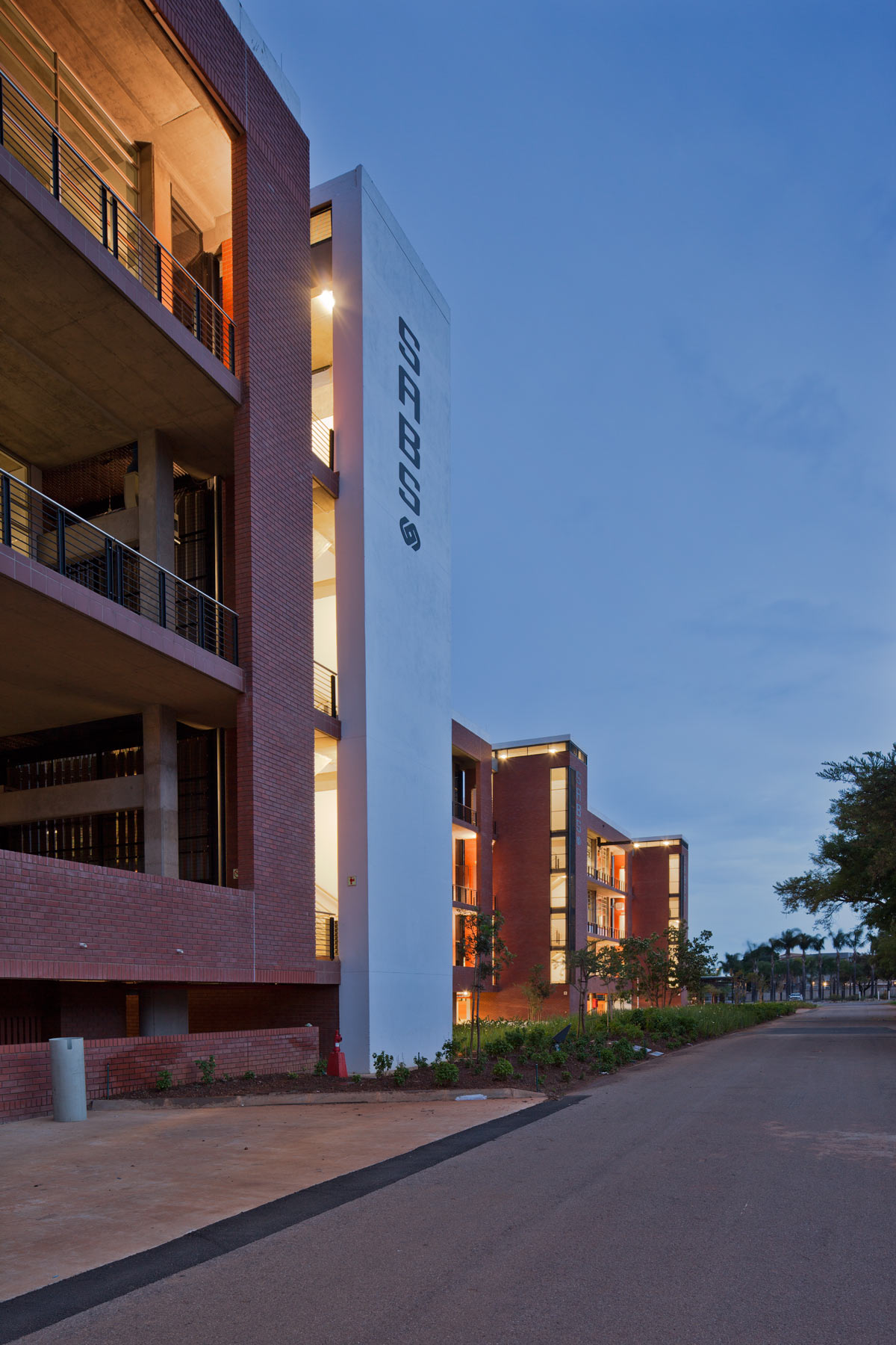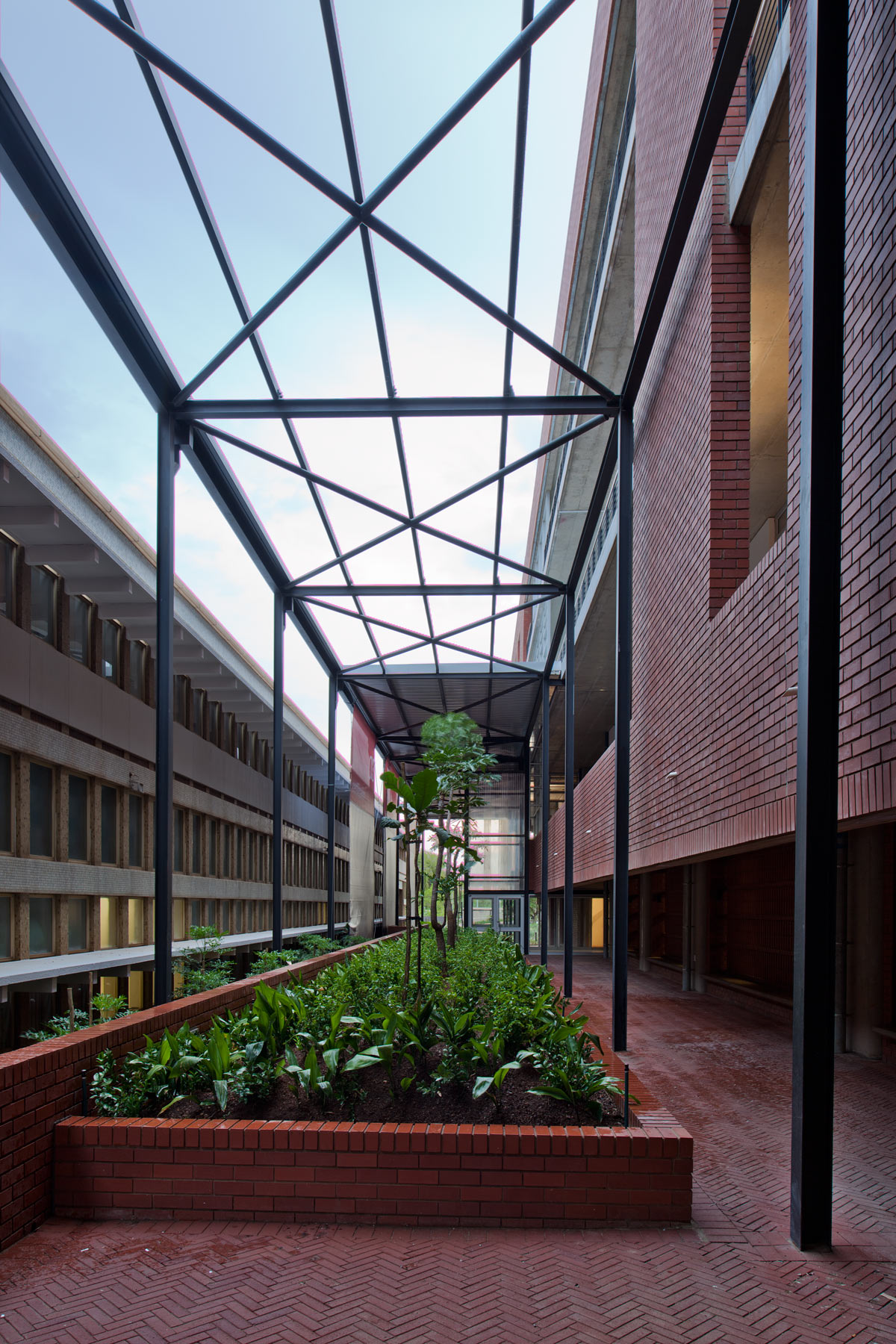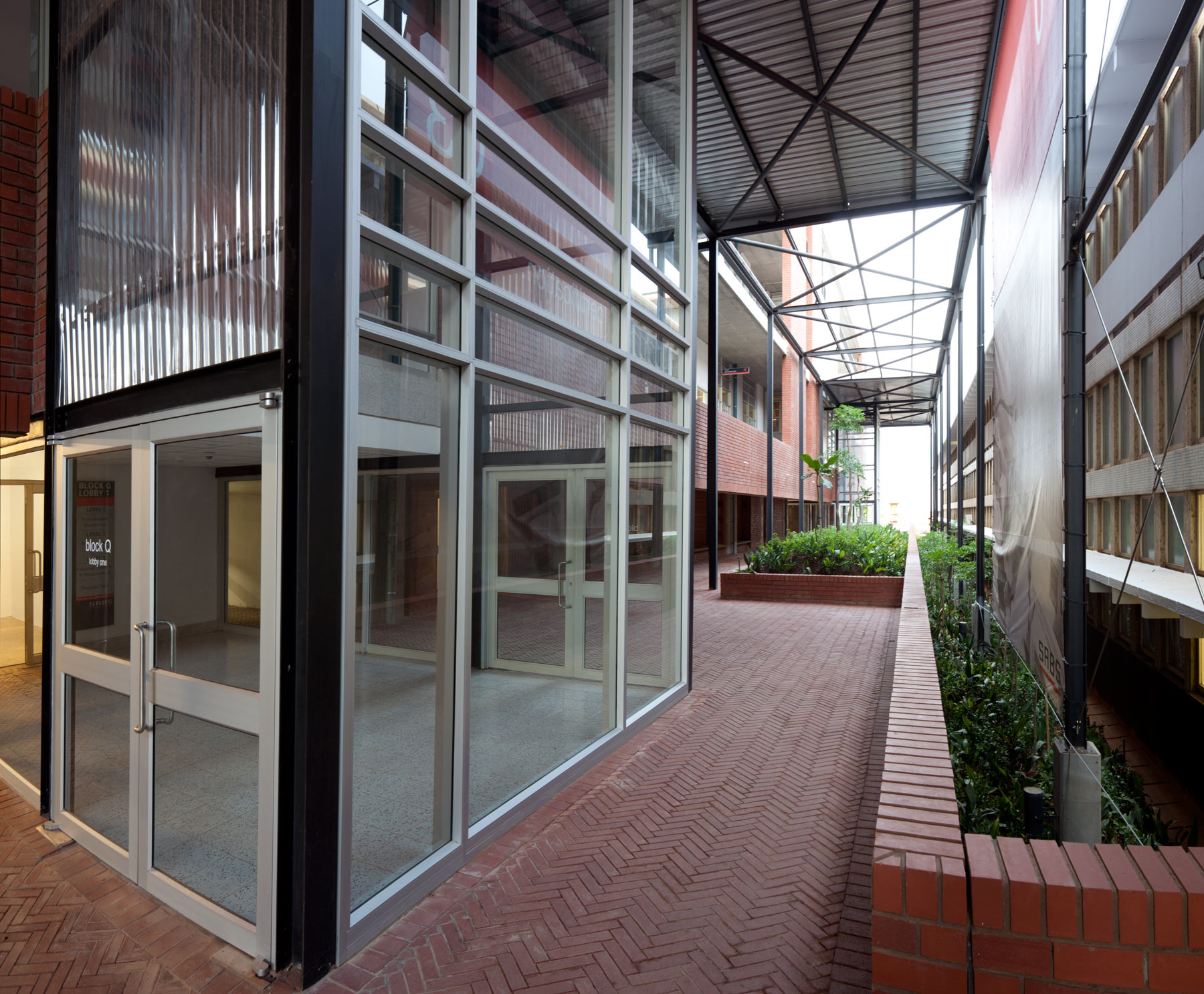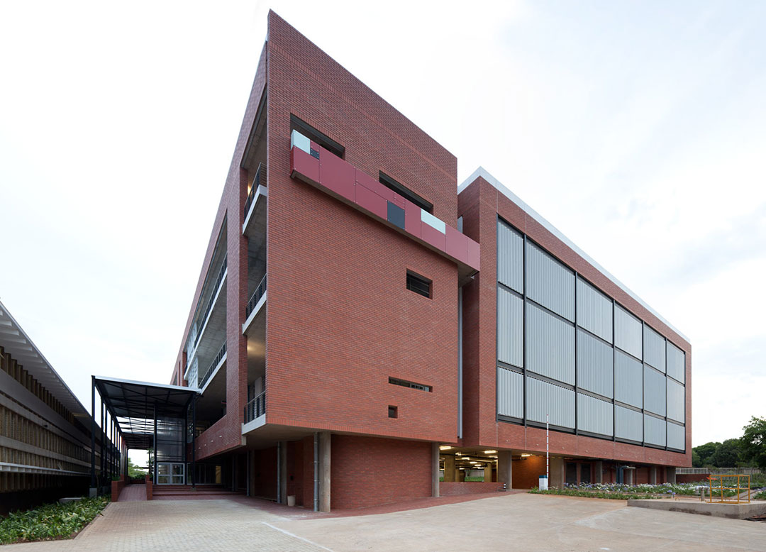 The structural grid of the existing buildings provided cues for the structural modular of the new building, while other formal cues were taken from the modernist neighbour. Extensive research was done on the latest architectural devices for laboratories, both nationally and internationally. Amongst others, this determined the provision of peristitial space for services, while also informing the flexible 3m-modular to allow for flexibility over time.
