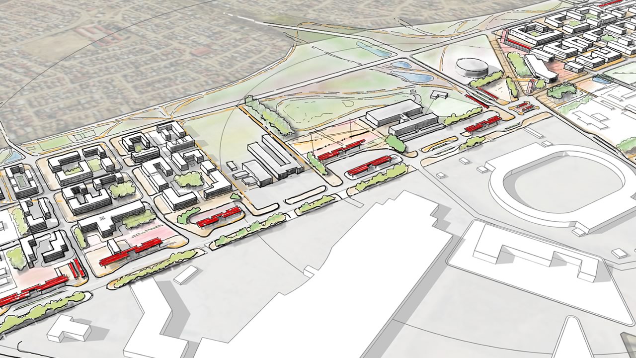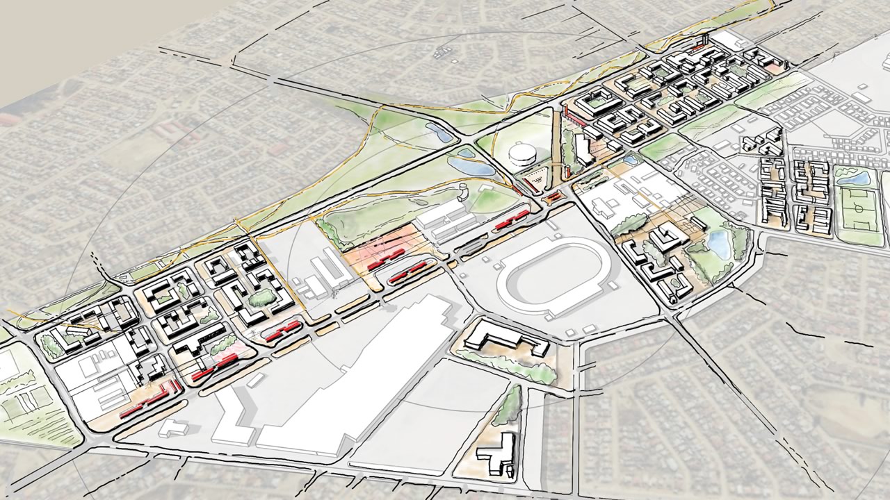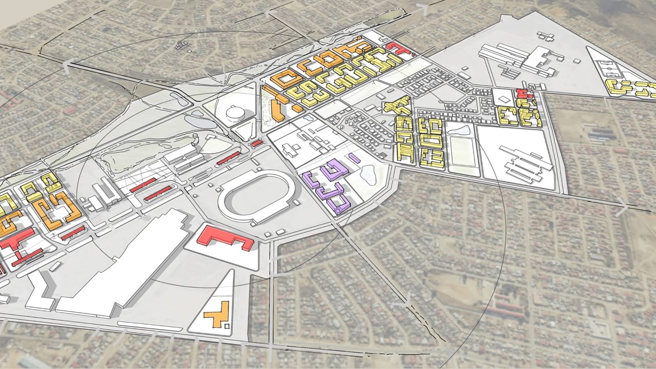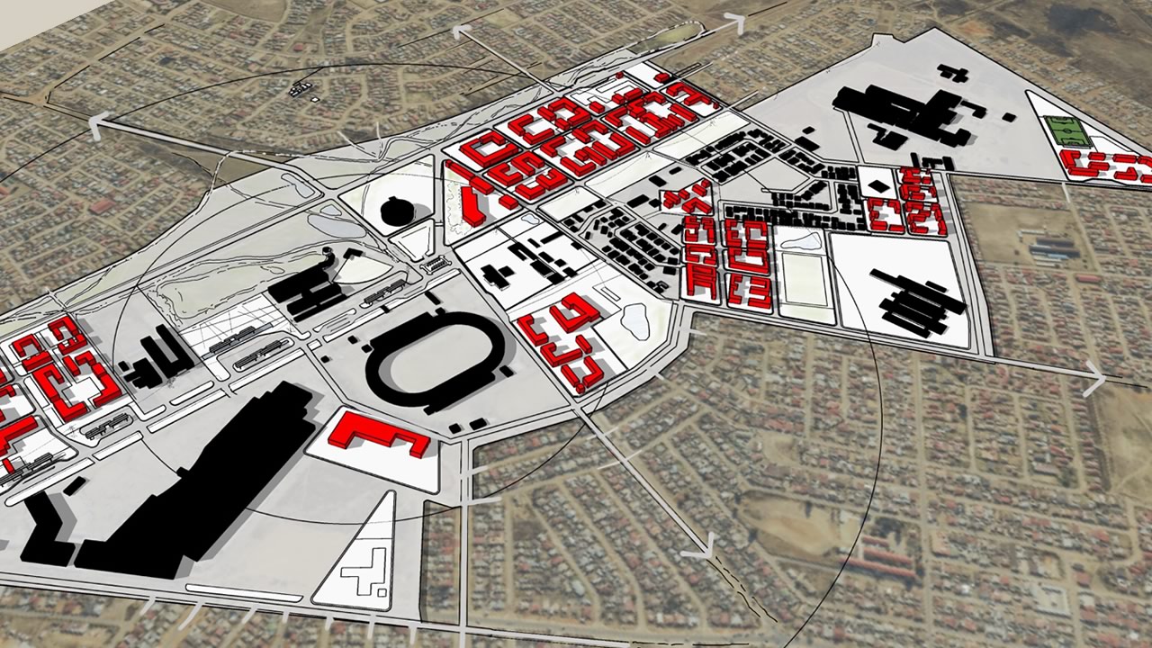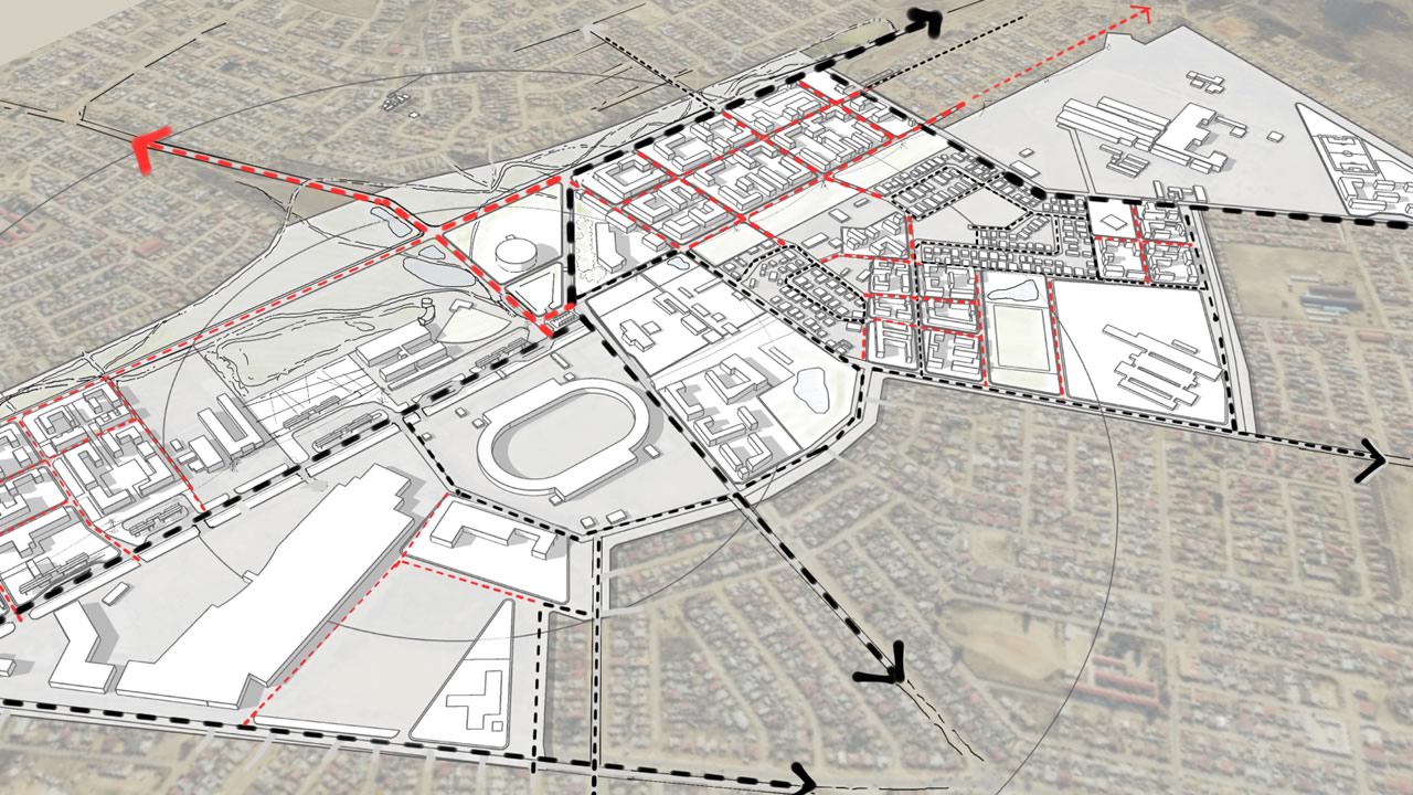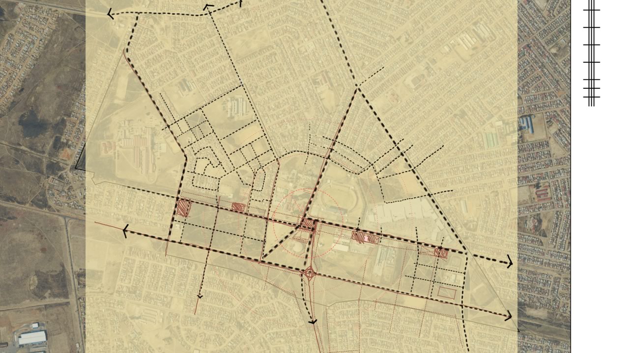 In this project for the NDPG programme, we identify catalytic moments that would support the economic growth of townships whilst stitching together unplanned open spaces and connecting movement networks towards a legible spatial integration. The project focuses on the SLOAP (spaces left over after planning) of the heart of the township. These are effectively the spaces that are left over through earlier uncoordinated development. This project explores the potential for such in-between spaces to become locations for strategic intervention. Small changes in an urban system can become a catalyst for an overall transformation of a region, from its micro-economy to its ecology. On the one hand, these left-over spaces have the potential for spatial justice. They can also help regulate micro-climate, replenish the water table, and support surrounding ecological networks.